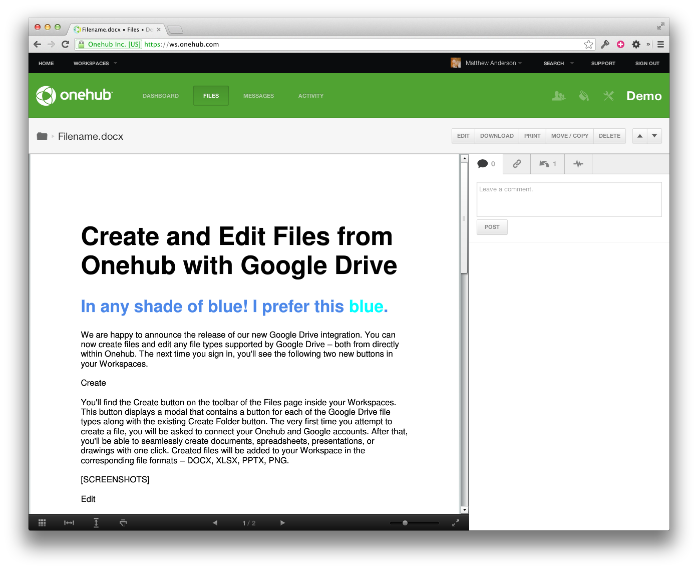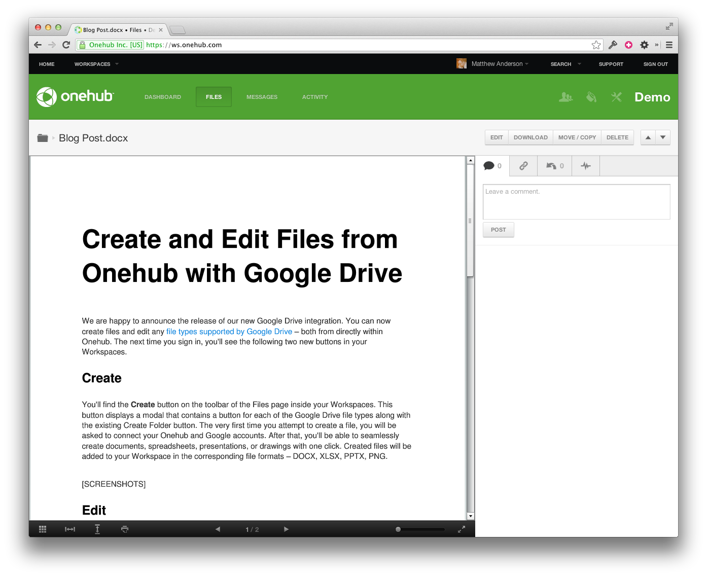 For more information on this feature including browser requirements and file support, please read our Google Drive support articles. As always, if you have any feedback, we’d love to hear it – post a comment below or email support@onehub.com.