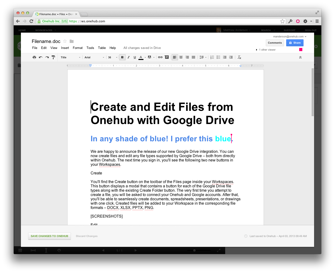 In addition to creating files in Onehub, you can now edit files as well. The Edit button can be found on the preview page of any supported file type, including files that you previously uploaded (not created via Google Drive). If the file you’re editing is not a format that Google Drive can create, your updates will be saved back to Onehub in the corresponding format. For example, if you edit Filename.doc, that file will become Filename.docx. Rest assured, your entire version history will be kept intact, only the file extension will be modified. In addition, we fully support Google Drive’s collaborative editing feature. This allows multiple Workspace users to edit the exact same document collaboratively, in real-time. When the last editor saves, all of the group’s changes will be saved back to Onehub.