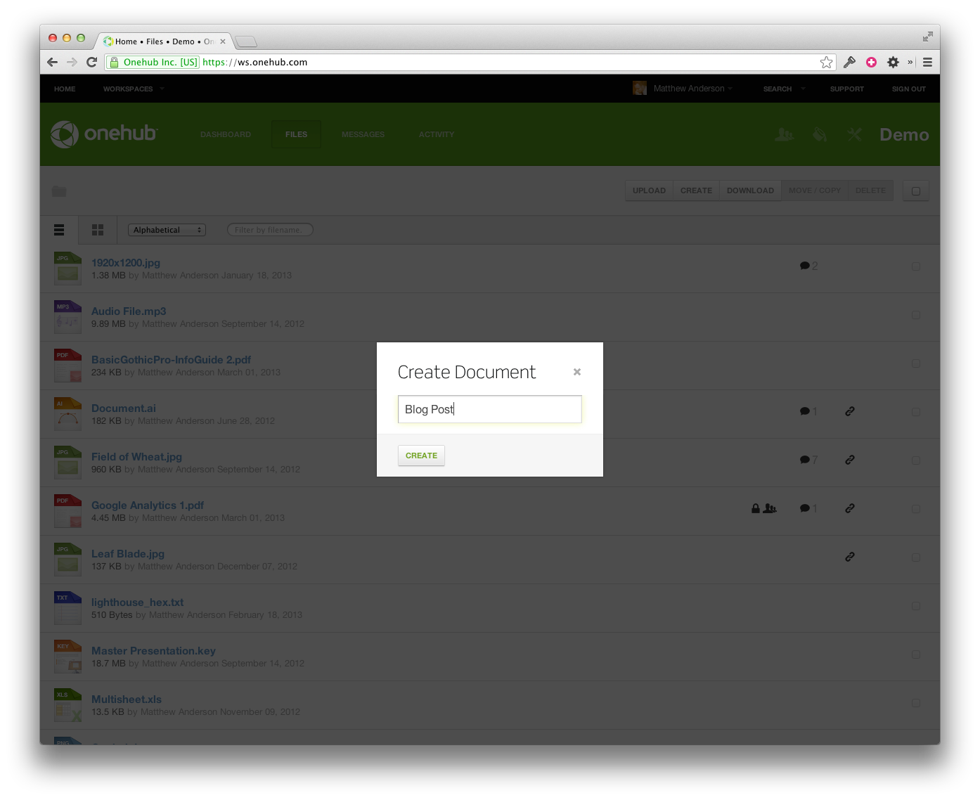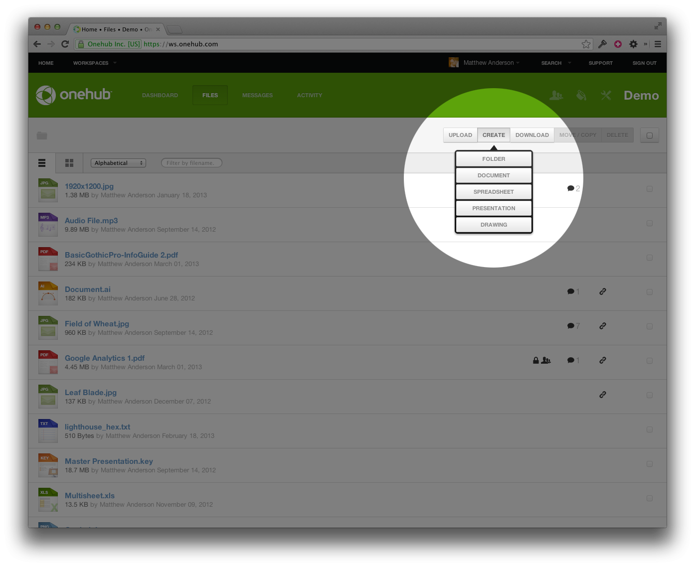 You’ll find the Create button on the toolbar of the Files page inside your Workspaces. This button displays a modal that contains a button for each of the Google Drive file types along with the existing Create Folder button. The very first time you attempt to create a file, you will be asked to connect your Onehub and Google accounts. After that, you’ll be able to seamlessly create documents, spreadsheets, presentations, or drawings with one click. Created files will be added to your Workspace in the corresponding file formats – DOCX, XLSX, PPTX, PNG.